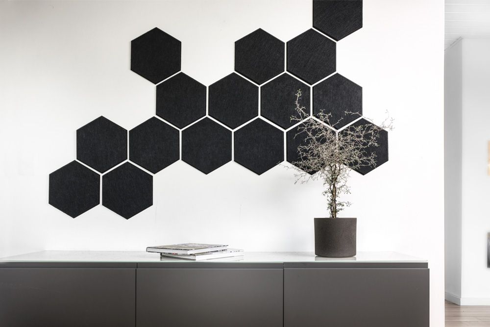 Akustikpanelerna tillför inte bara en elegant och modern känsla till rummet. De minskar även oönskat ljud och förbättrar akustiken.