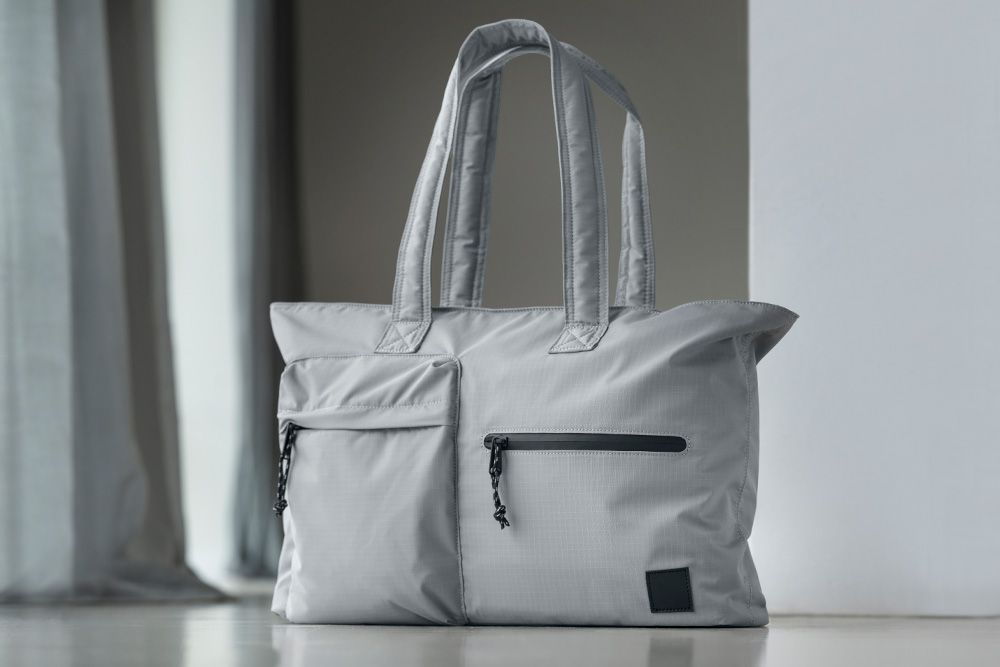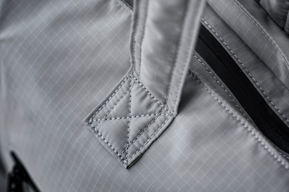 Ett algbaserat skum ger väskan stadga, och med de två remmarna är den bekväm att bära över axeln. Yttertyget är 100% återvunnen nylon, medan fodret är 100% återvunnen polyester.